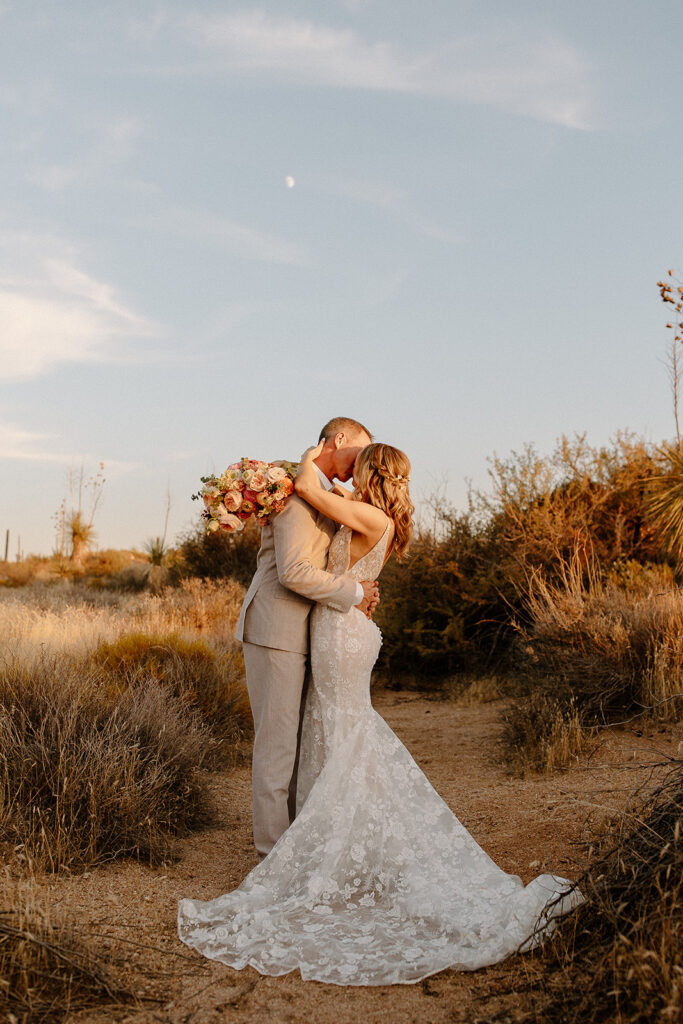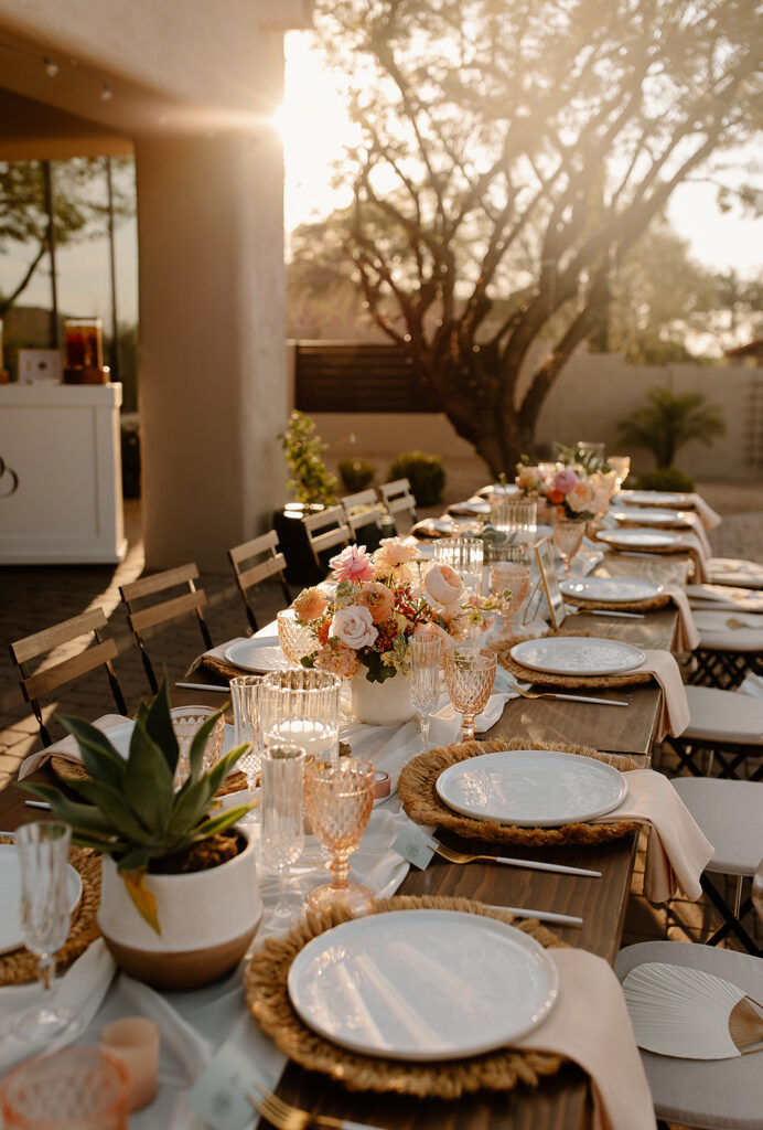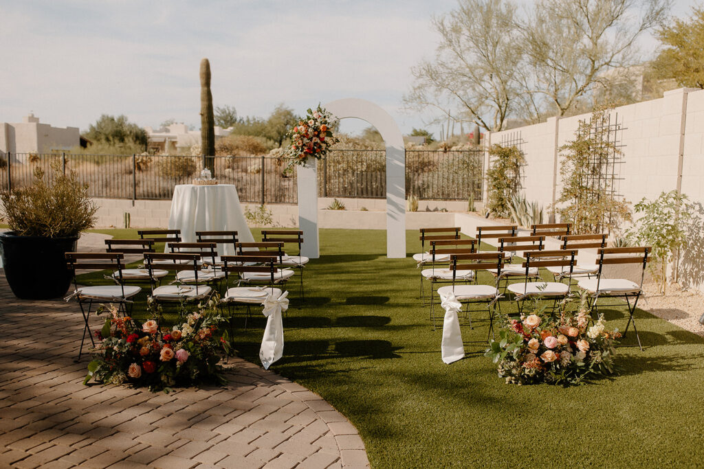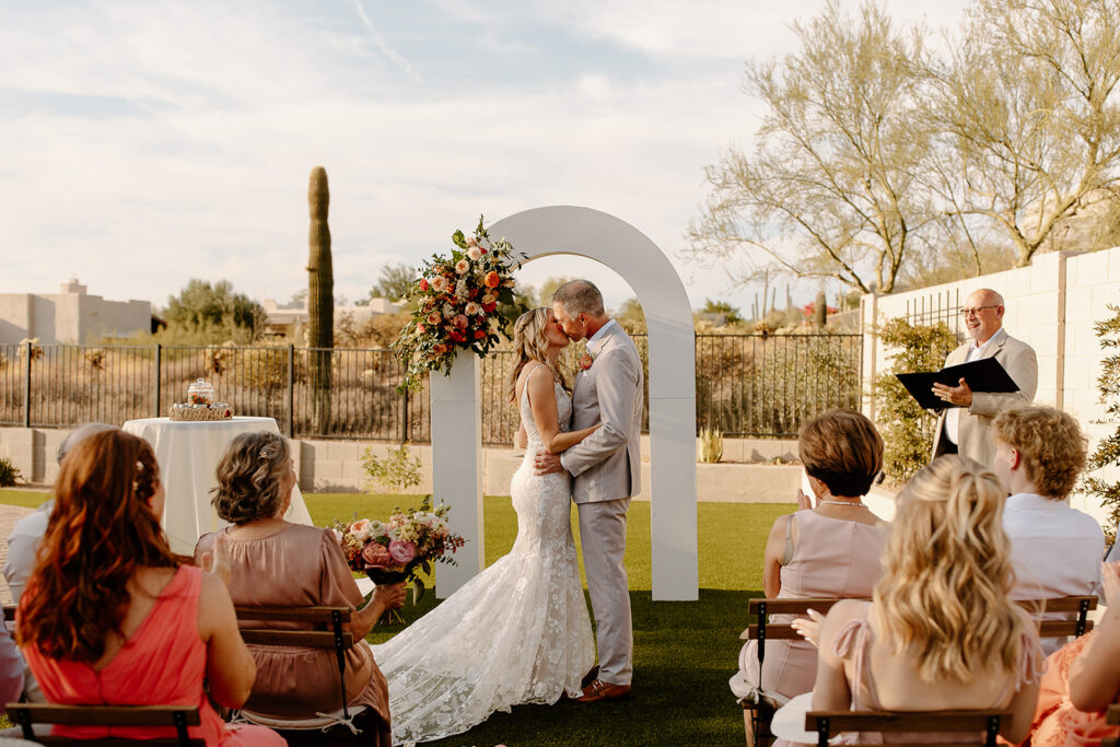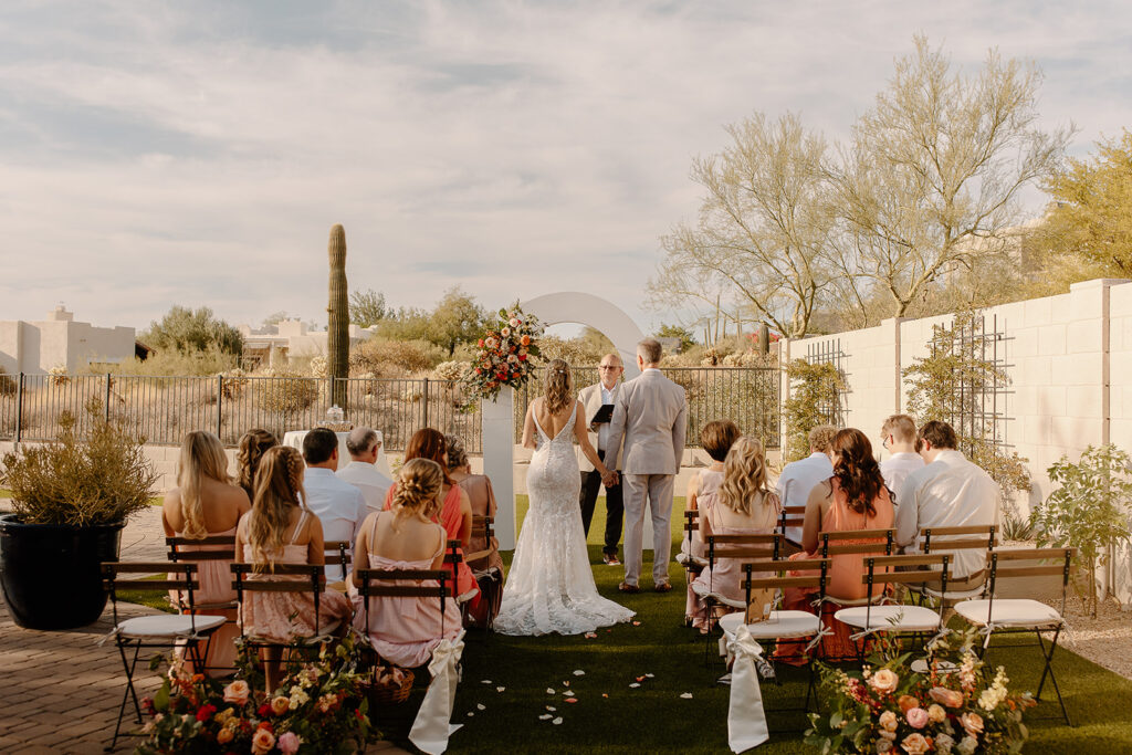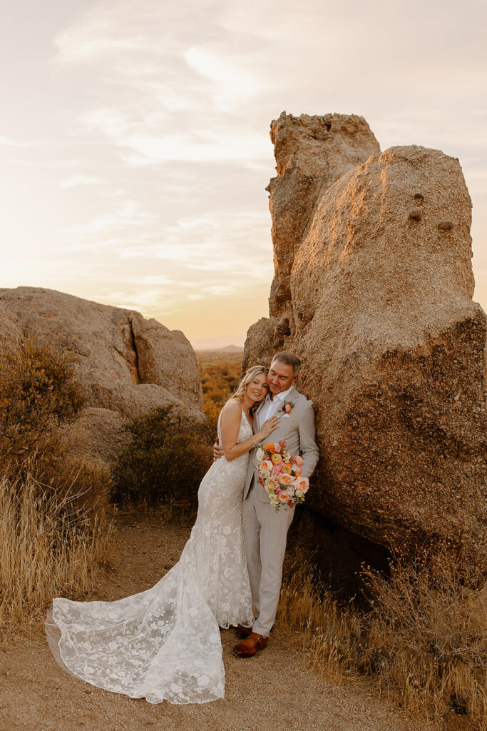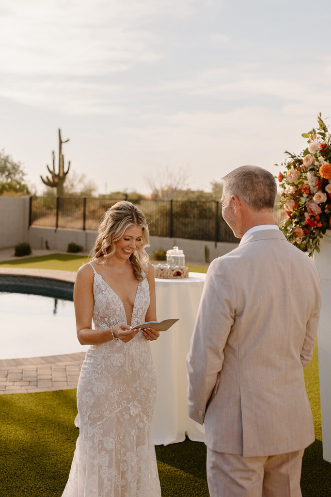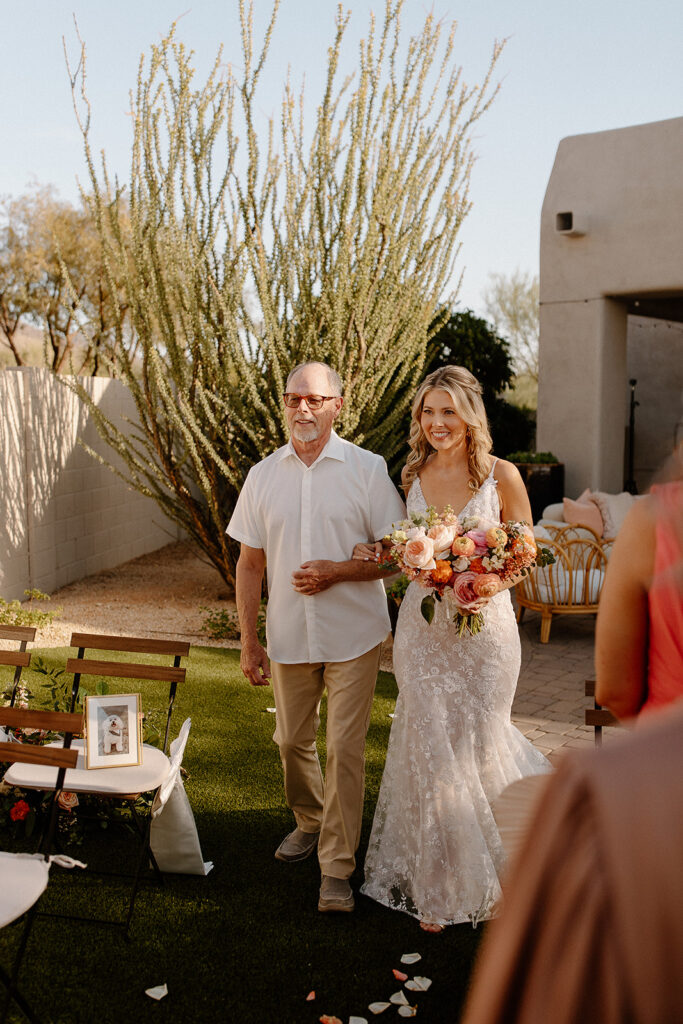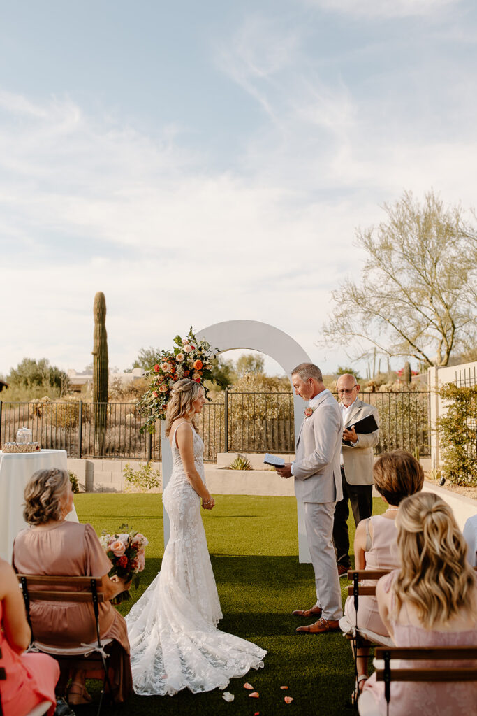 The wedding took place at Danielle’s sister’s home in Scottsdale. Peach, pink, and coral florals adorned a bohemian arch with string lights and lounge seating. The desert landscape provided a beautiful backdrop for romantic portraits and family photos.
