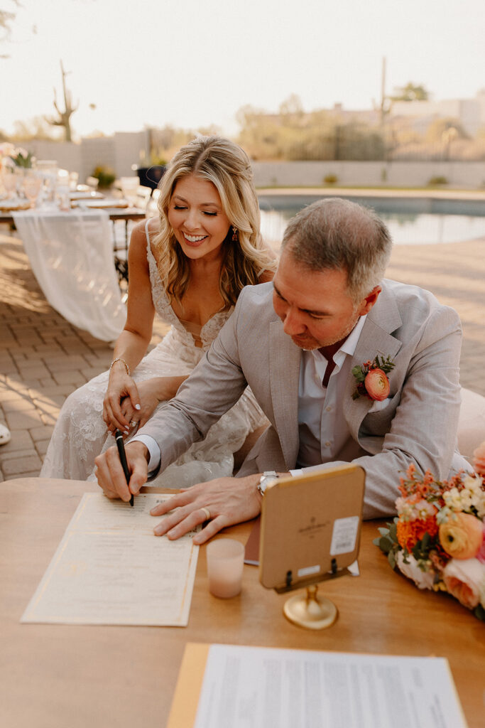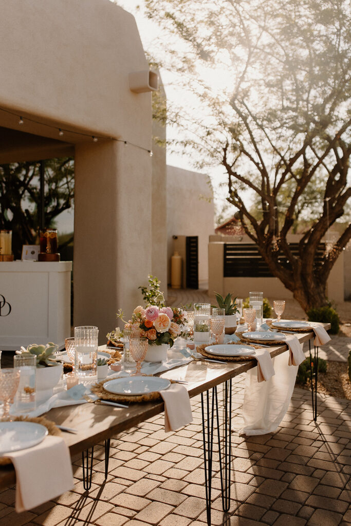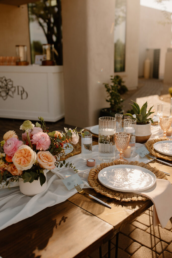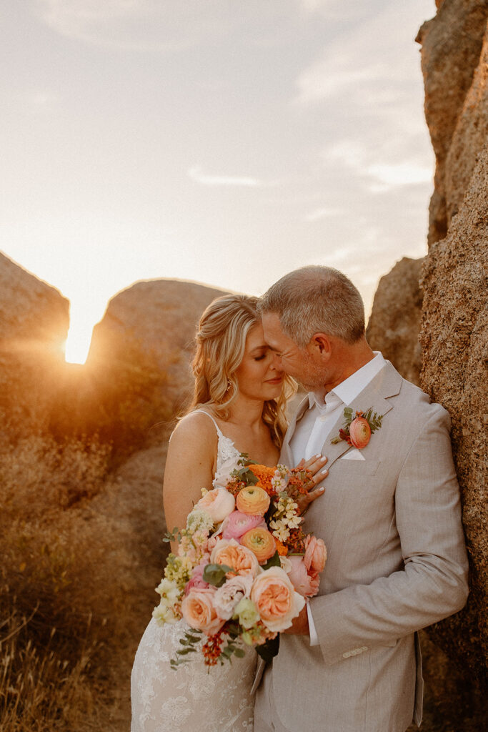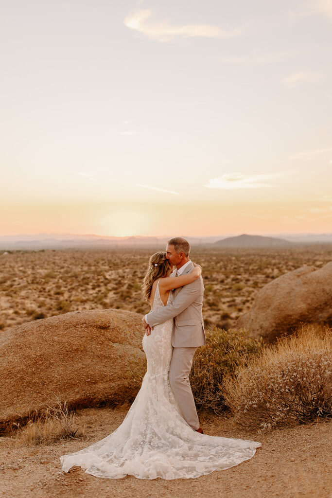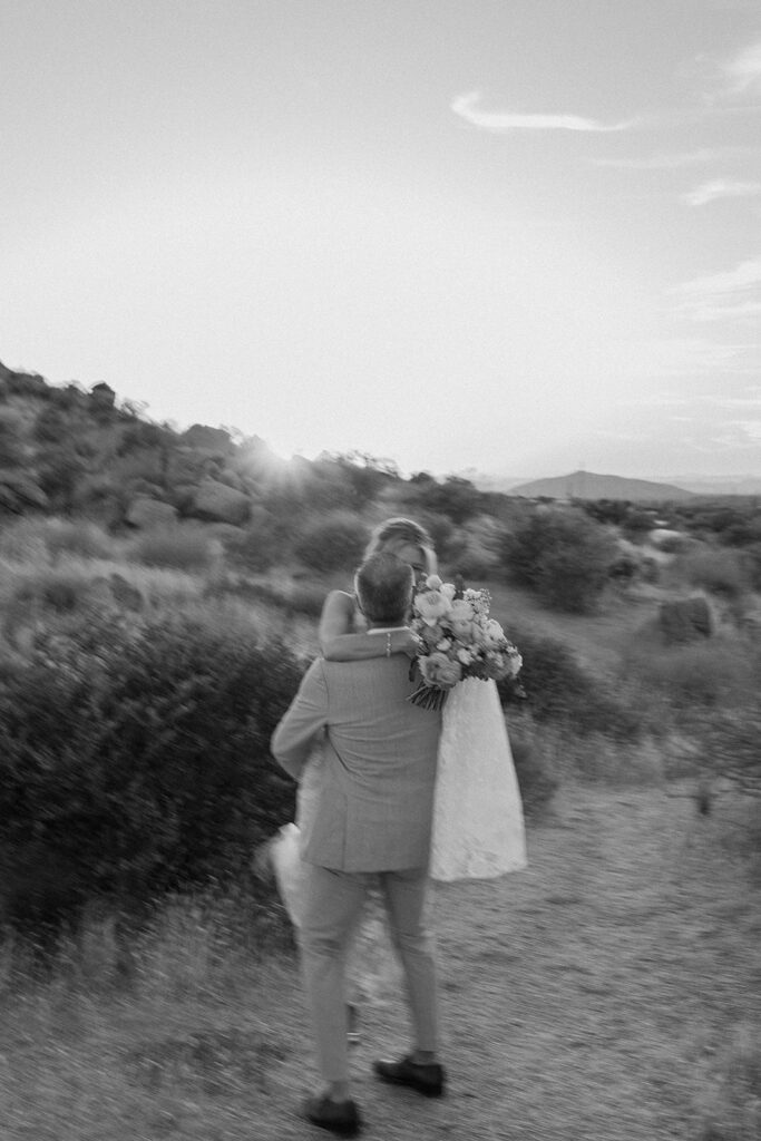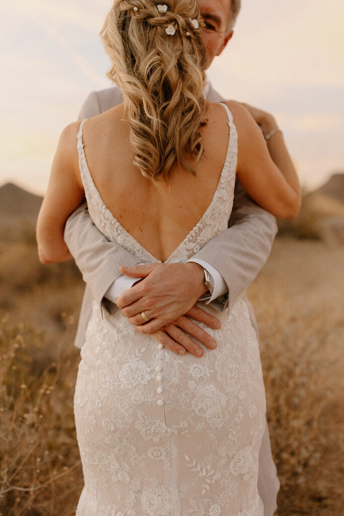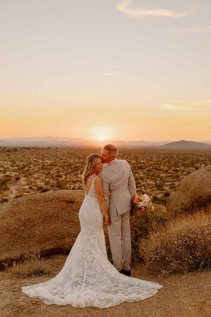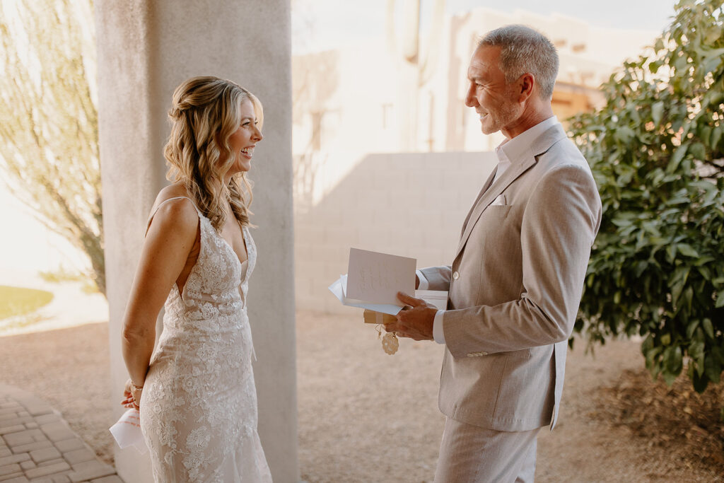 The wedding took place at Danielle’s sister’s home in Scottsdale. Peach, pink, and coral florals adorned a bohemian arch with string lights and lounge seating. The desert landscape provided a beautiful backdrop for romantic portraits and family photos.
