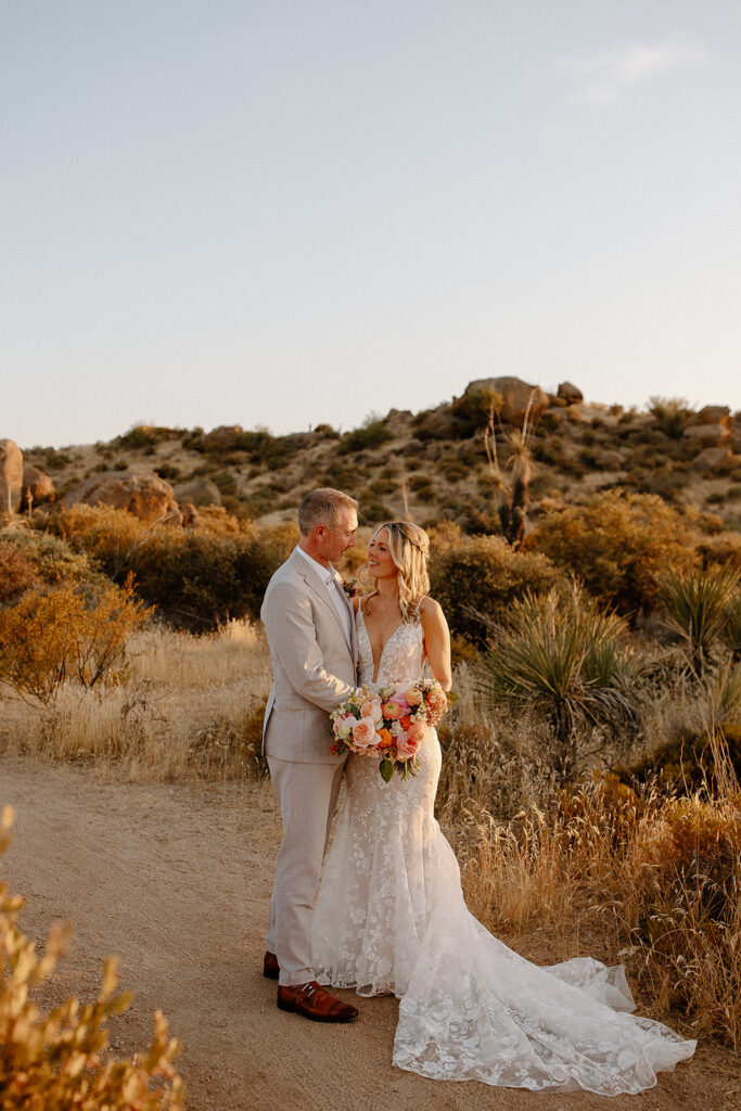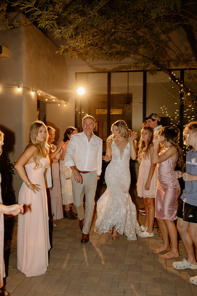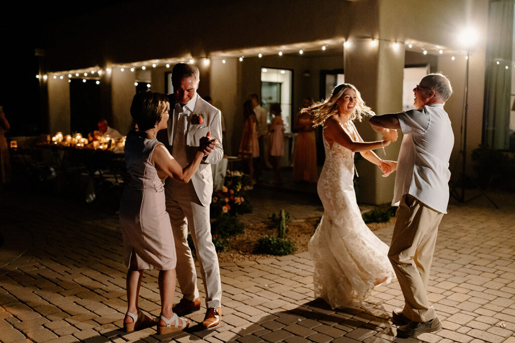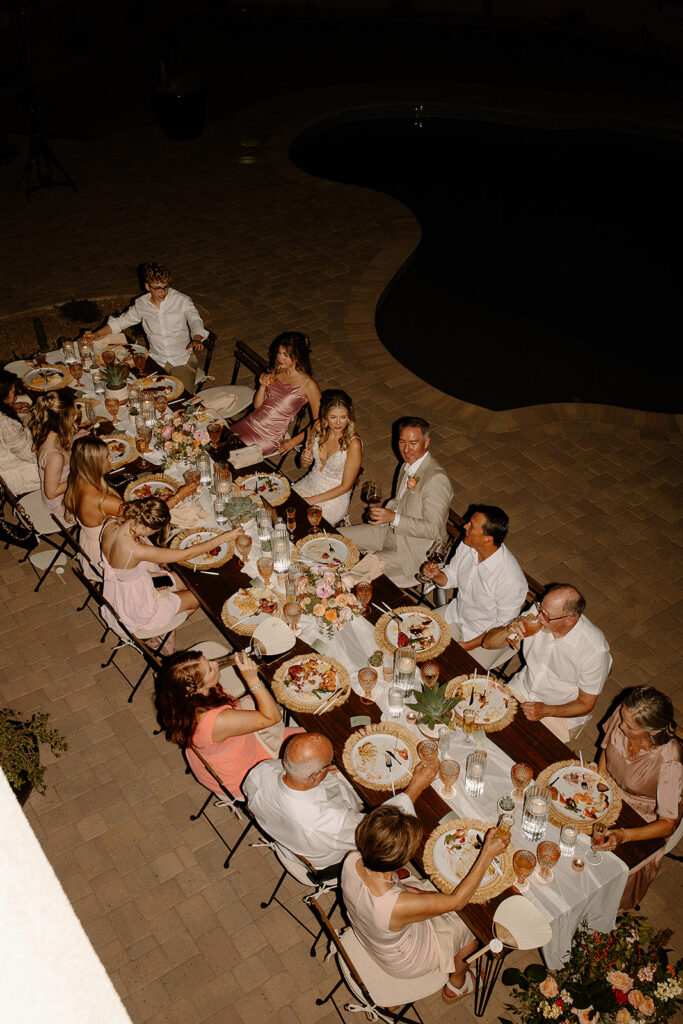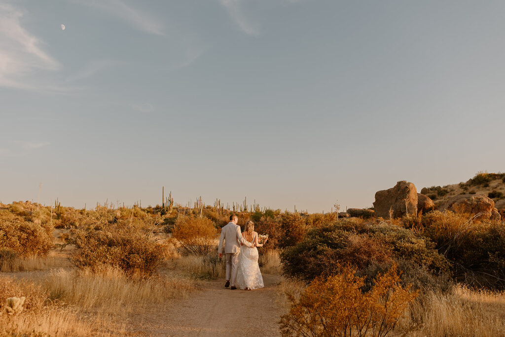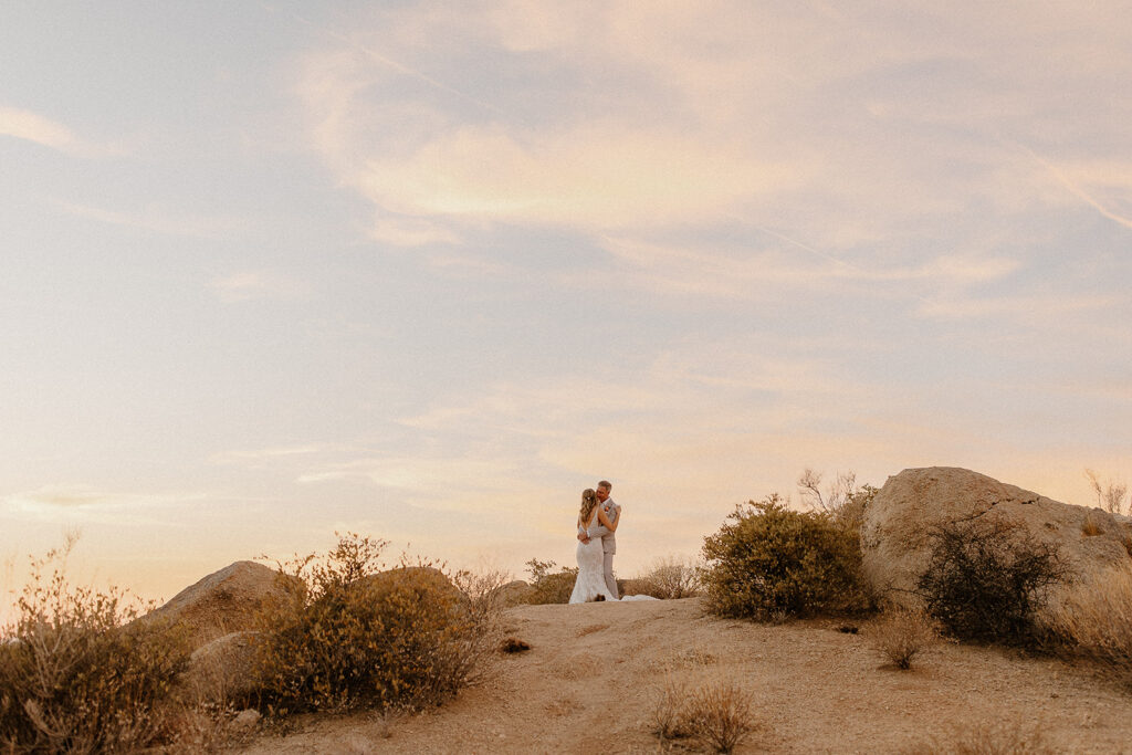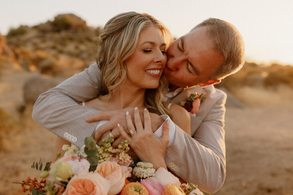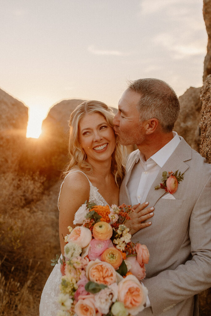 The wedding took place at Danielle’s sister’s home in Scottsdale. Peach, pink, and coral florals adorned a bohemian arch with string lights and lounge seating. The desert landscape provided a beautiful backdrop for romantic portraits and family photos.