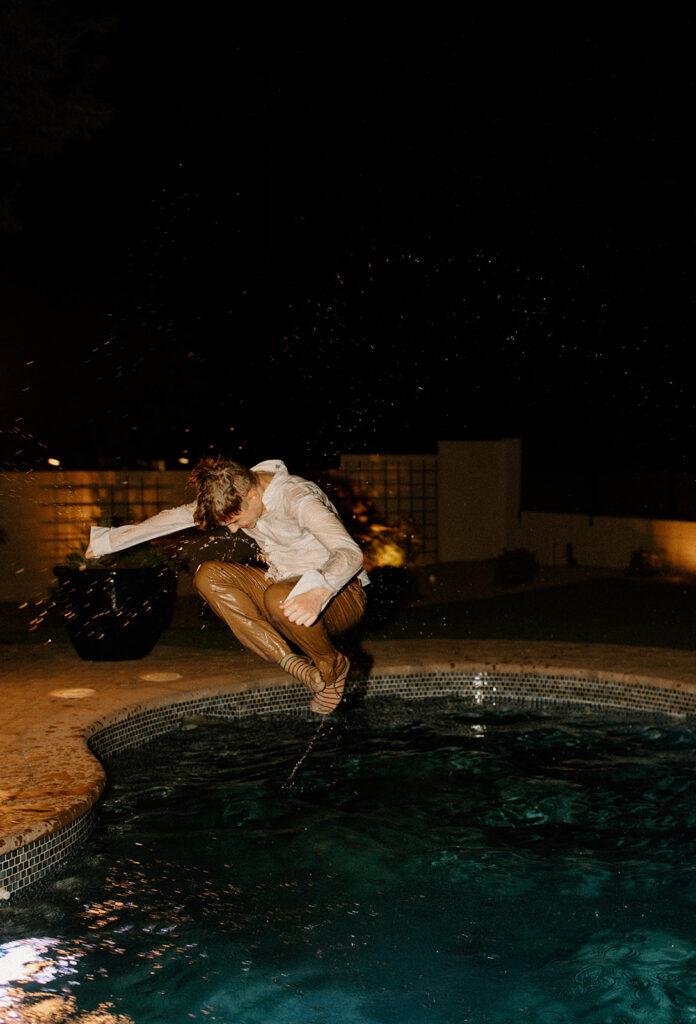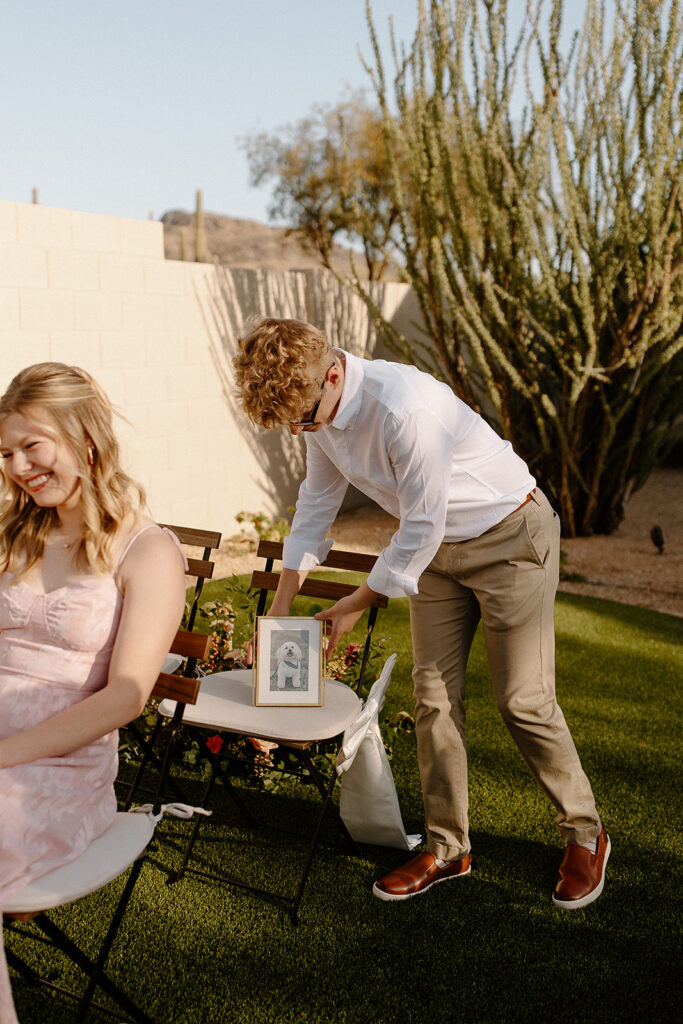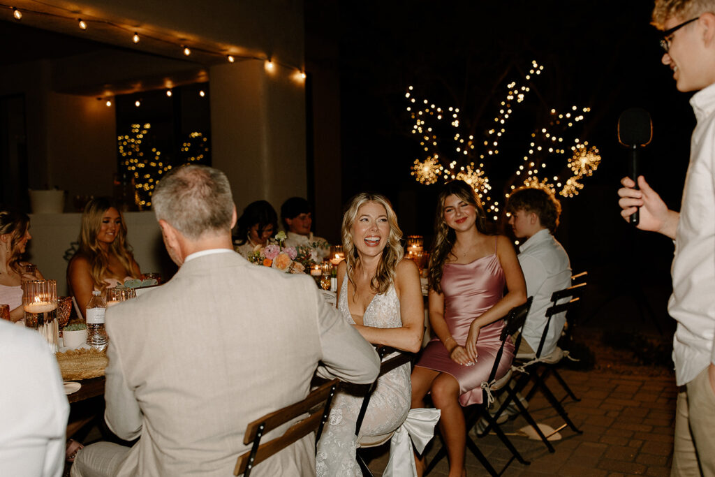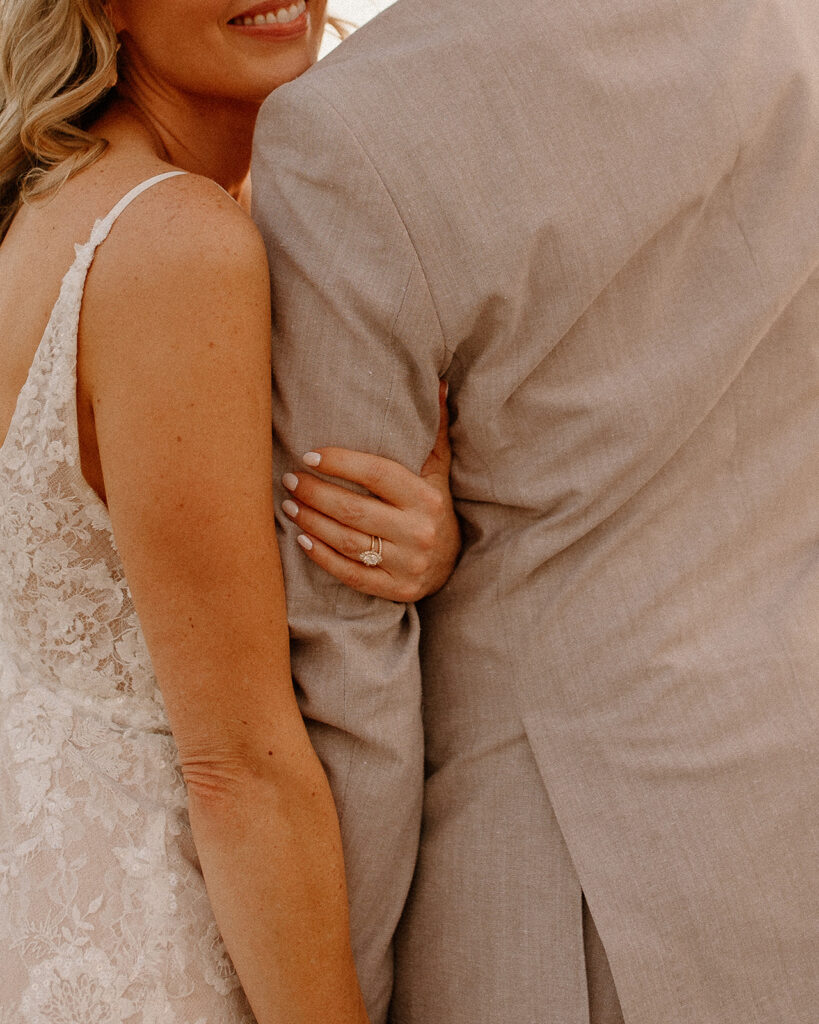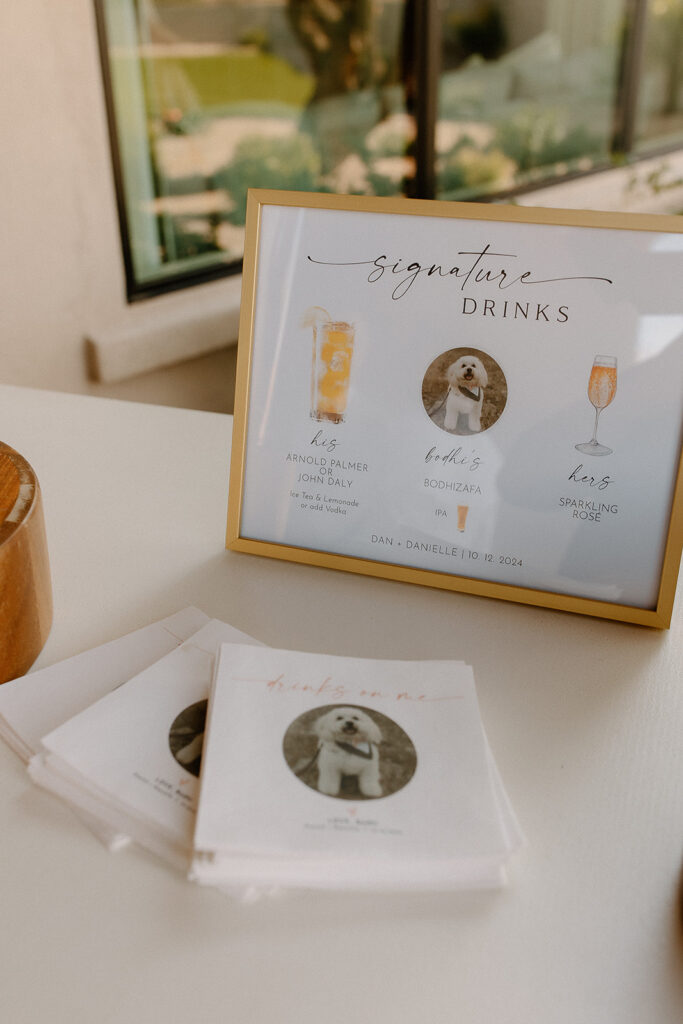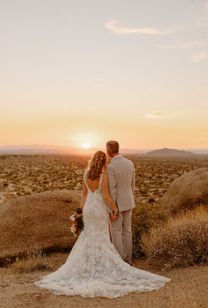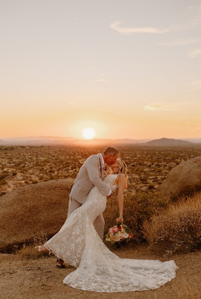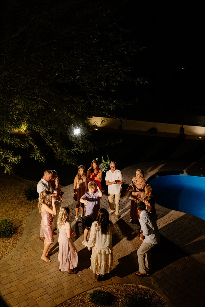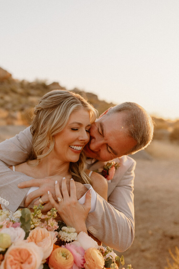 The wedding took place at Danielle’s sister’s home in Scottsdale. Peach, pink, and coral florals adorned a bohemian arch with string lights and lounge seating. The desert landscape provided a beautiful backdrop for romantic portraits and family photos.
